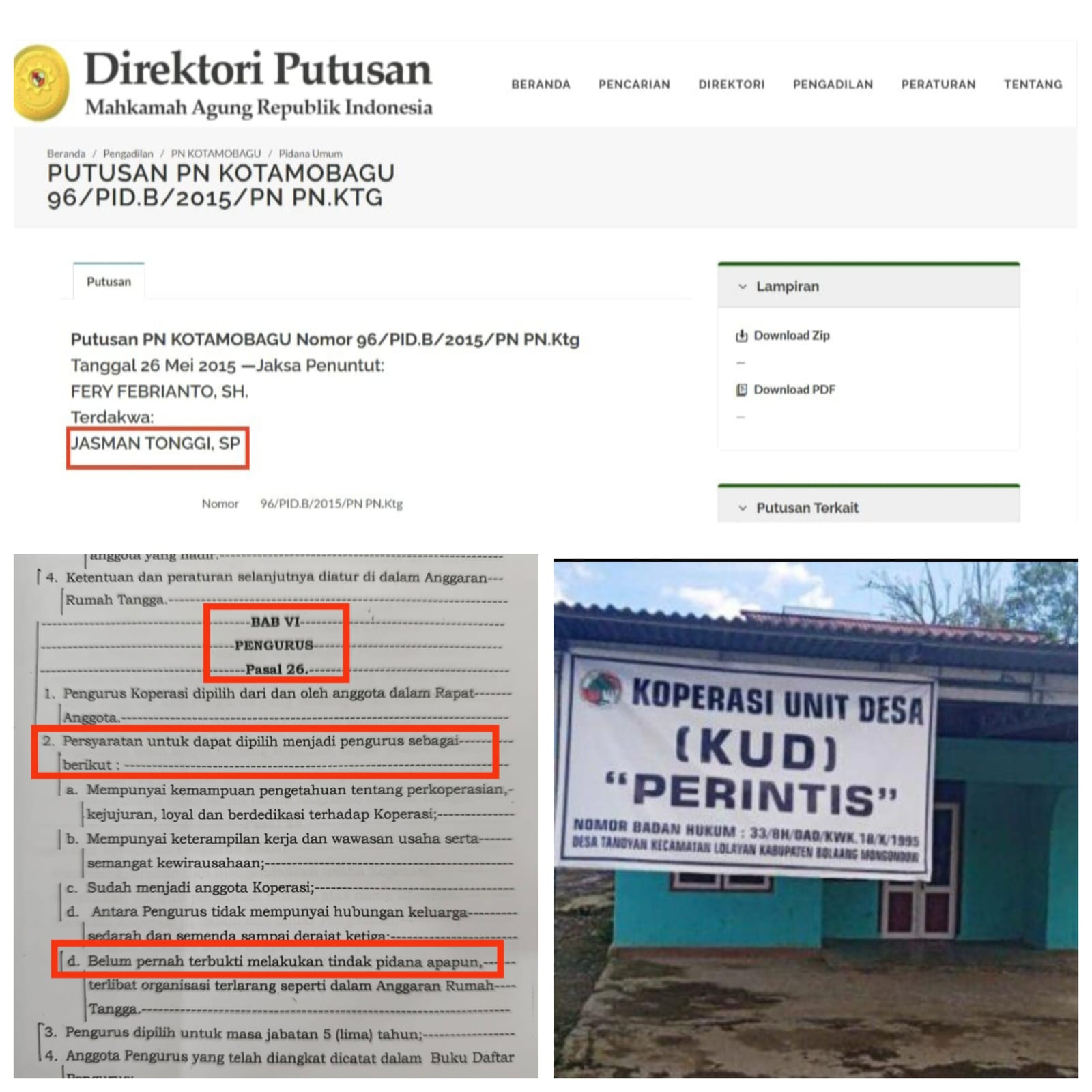 Pelopormedia.id ||BOLAANG MONGONDOW– Polemik kepemimpinan Koperasi Unit Desa (KUD) Perintis kian memanas setelah muncul fakta hukum bahwa Ketua KUD, Jasman Tonggi, SP, pernah divonis bersalah melakukan tindak pidana berdasarkan putusan Pengadilan Negeri Kotamobagu Nomor 96/Pid.B/2015/PN Ktg tanggal 26 Mei 2015.