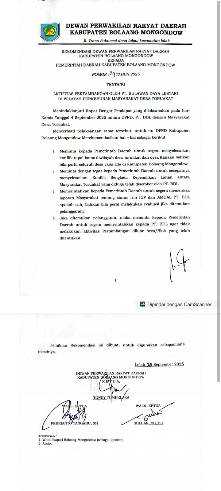 Bolaang Mongondow — Setelah lebih dari sepekan tertutup dari publik, rekomendasi yang dikeluarkan oleh Dewan Perwakilan Rakyat Daerah (DPRD) Kabupaten Bolaang Mongondow akhirnya mencuat ke permukaan. Dokumen tersebut disebut-sebut merupakan hasil dari rapat dengar pendapat antara DPRD, masyarakat, dan pihak perusahaan tambang PT Bulawan Daya Lestari (BDL).