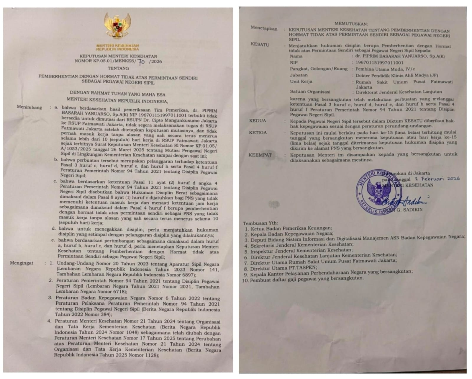 ‎Dalam dokumen resmi yang ditandatangani Menteri Kesehatan pada 2 Februari 2026 di Jakarta, disebutkan bahwa dr. Piprim dinyatakan terbukti tidak melaksanakan tugas sebagai PNS di lingkungan setelah mutasi dari RSUP Dr. Cipto Mangunkusumo.